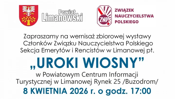 W Limanowej sztuka znów wyjdzie z sal lekcyjnych i domowych pracowni prosto do centrum miasta. 8 kwietnia o godzinie 17:00 w Powiatowym Centrum Informacji Turystycznej otworzy się wystawa „Uroki Wiosny”, przygotowana przez członków Związku Nauczycielstwa Polskiego Sekcji Emerytów i Rencistów. To spotkanie ma w sobie coś z początku sezonu – lekkiego, kolorowego i pełnego oddechu. Na ścianach galerii przy Rynku 25 pojawią się obrazy i prace szesnastu twórców z powiatu limanowskiego.