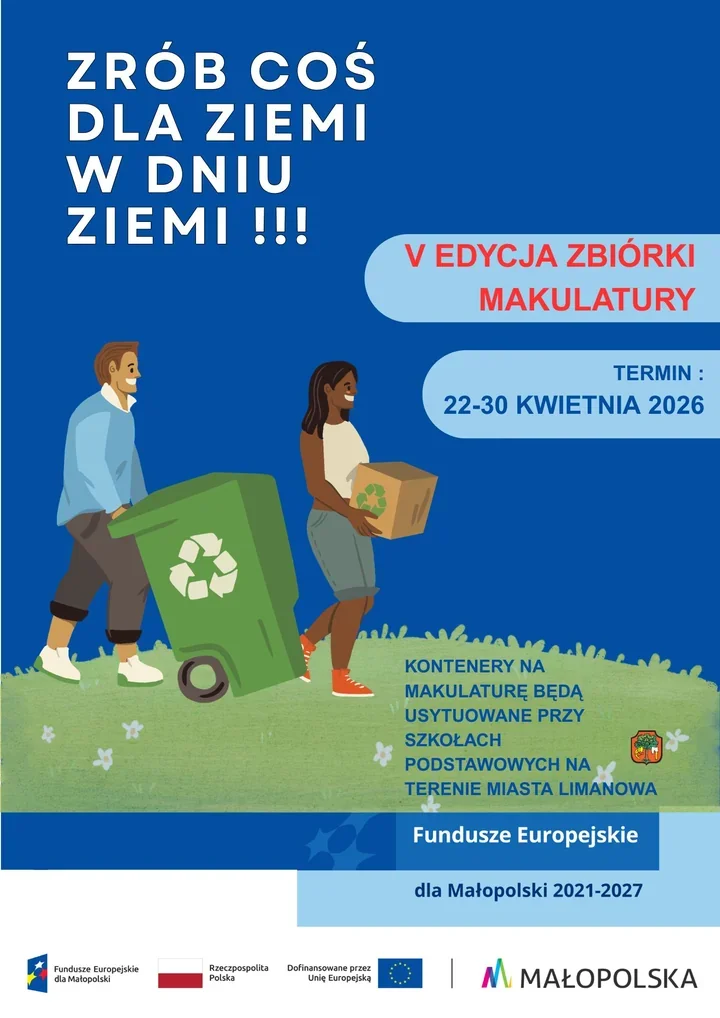Ekodoradca Miasta Limanowa zaprasza mieszkańców do udziału w zbiórce makulatury, organizowanej w ramach corocznych obchodów Dnia Ziemi. W mieście staną specjalne kontenery przeznaczone na papier i tekturę, ustawione przy szkołach podstawowych, tak by oddanie niepotrzebnych kartonów i papieru nie wymagało dalekiego dojazdu.